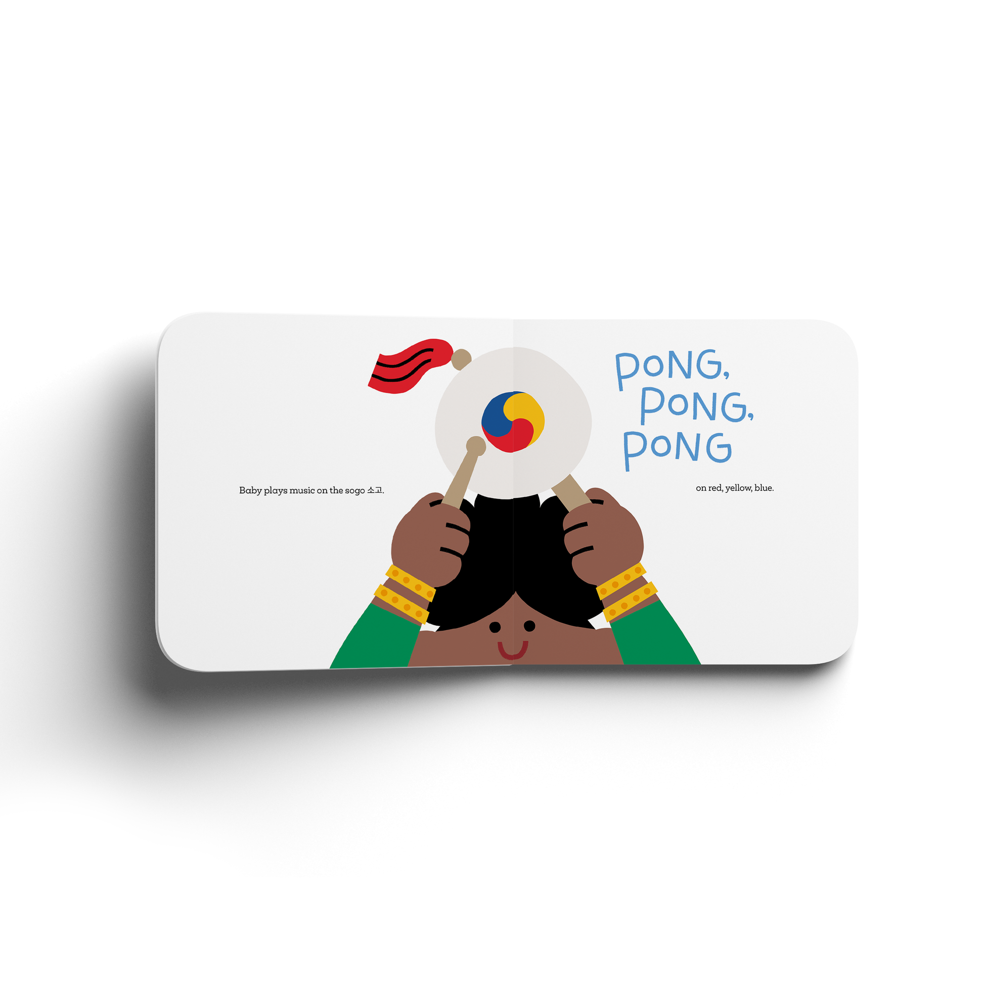 From being carried in a warm podaegi to celebrating Children’s Day to spotting triangles at Bukchon Hanok Village, baby discovers the local culture and traditions of South Korea. Baby Go! South Korea explores colors, shapes, sounds and sensory experiences through travel. Baby is carried in a podaegi 포대기. A quilted blanket to keep baby warm and close.