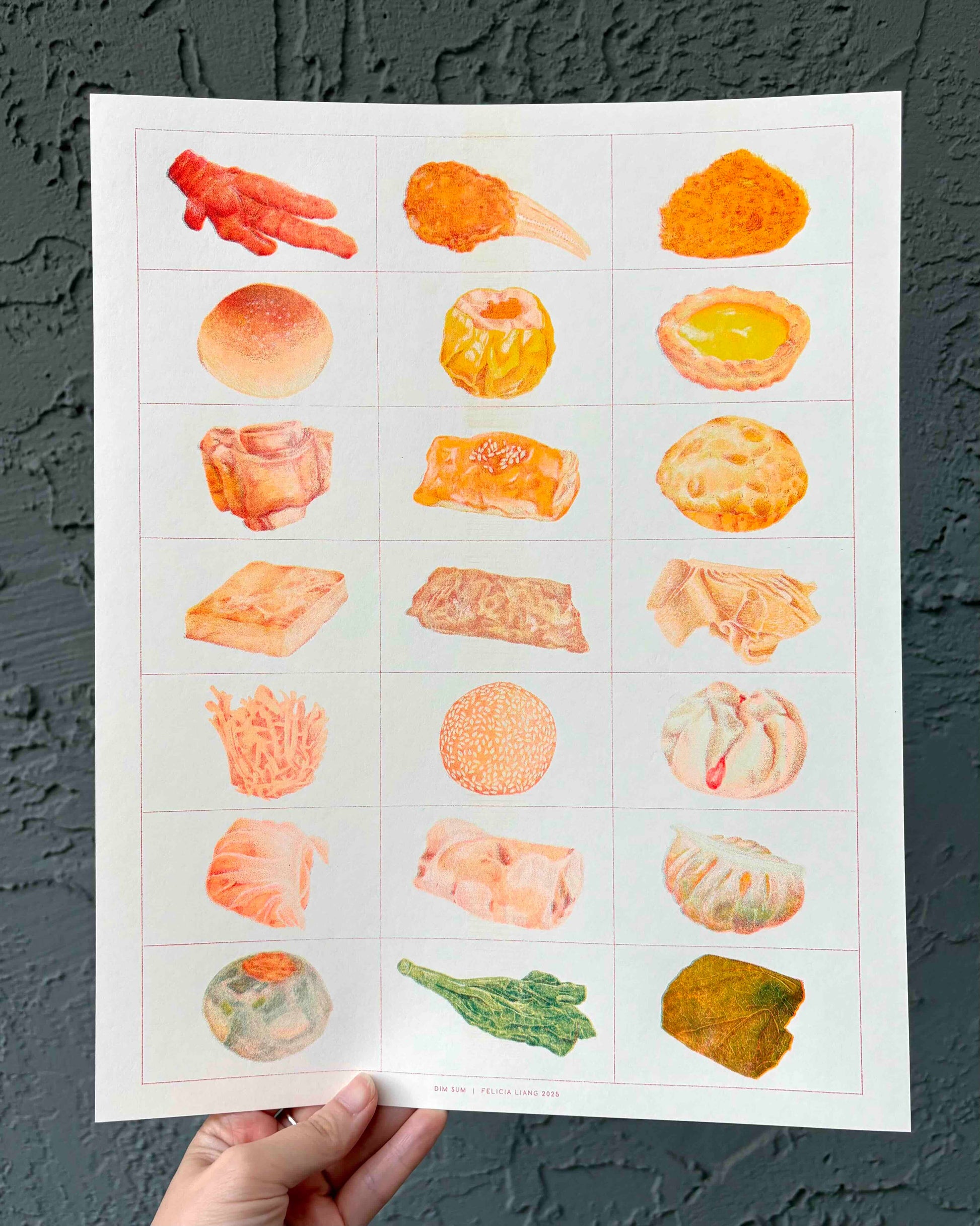 A four-color (yellow, fluorescent orange, red, and blue) risograph print of 21 popular dim sum items, including chicken feet, shumai, shrimp dumplings (har gow), sesame balls, tofu skin rolls, turnip cakes (luo buo gao), pork spare ribs, pan fried dumplings and puffs, and sticky rice. The grid and composition of the print roughly mirrors color charts that showcase the different colors you can create with a few inks.