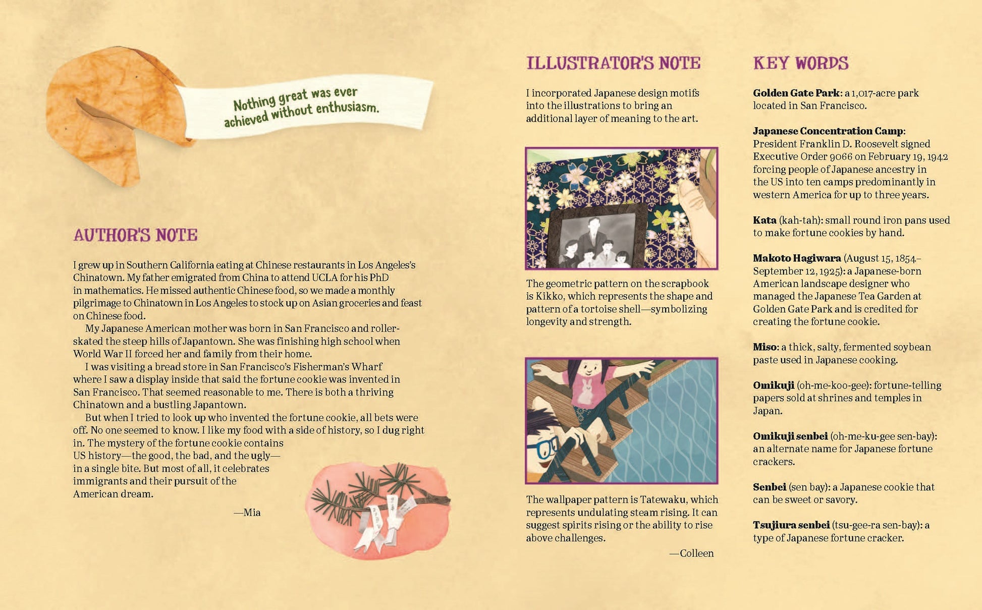 Grandma Miyako hosts her grandchildren for a takeout meal. Of course, at the end of the meal, she hands out the fortune cookies and begins to share the story of this popular treat with the attentive children as they munch on them. She claims to know the true inventor of the fortune cookie, but the history is not entirely clear. Using "fortunes" as headings, each section of the book delivers an episode in the unusual history of the fortune cookie and lays out the great debate about where and when they were first made. California was certainly the location, but in which city was the original baker located? This picture book looks inside these crunchy, biscuity treats to reveal the cultural origins and locations of the creators. Along the way, we discover some surprising history regarding this delicious edible delight, including a rivalry between bakers that remains somewhat unresolved today. Fortune Cookies for All is a compelling mystery featuring US history—the good, the bad, and the ugly—in a single bite. But most of all, it celebrates immigrants and their pursuit of the American dream.