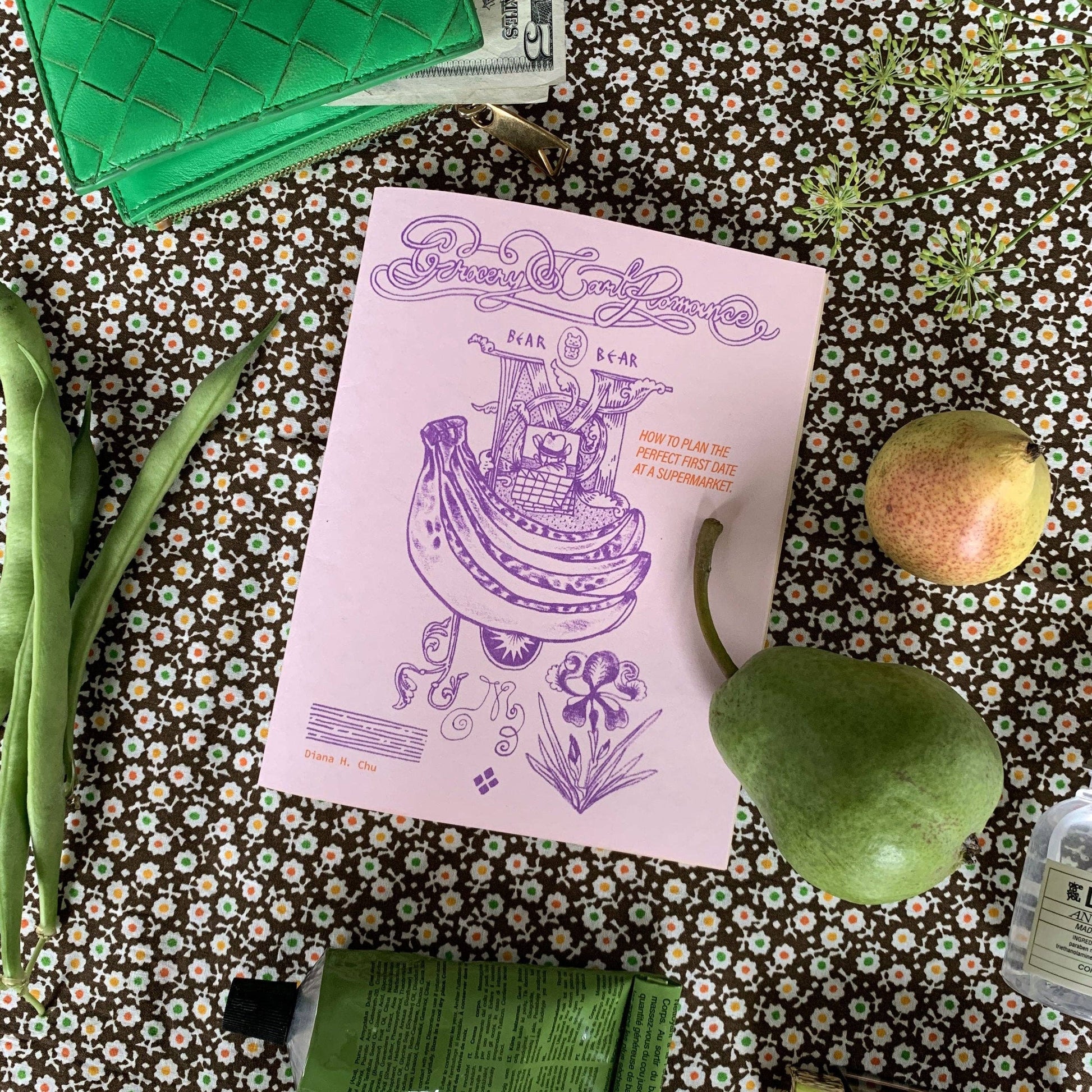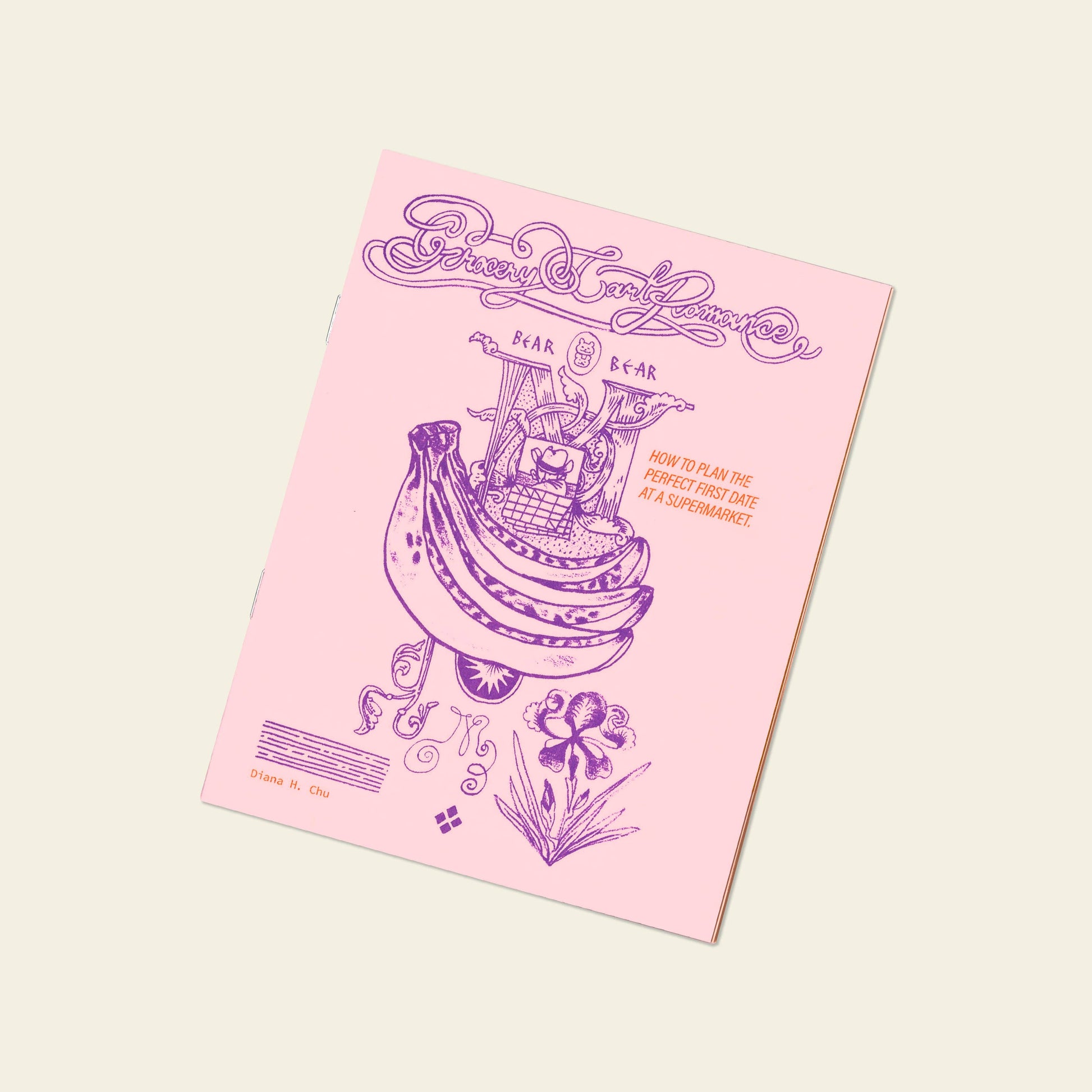 Risograph zine by Diana H. Chu “Back before White Claw was a twinkle in a drunk dolphin's eye.” — Diana, looking back on the 2010's Grocery Cart Romance is an instructional zine about how to plan a "perfect" first date at a supermarket. Drawing off of Diana's first-hand dating experience back in her early twenties and featuring easy-to-read hot tips, photos, and doodles, this zine is for folks who want to meet potential mates out in the real world without all the main-character-energy romantic fuss.