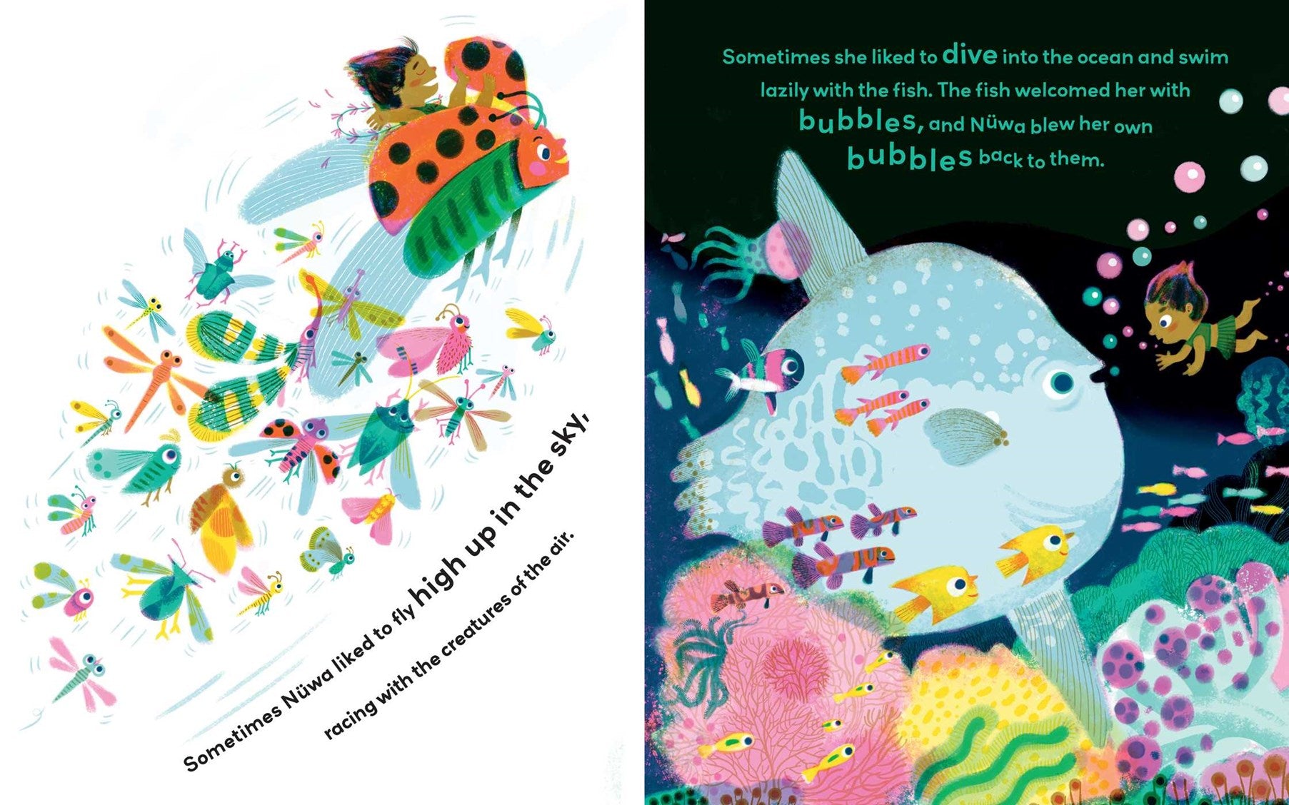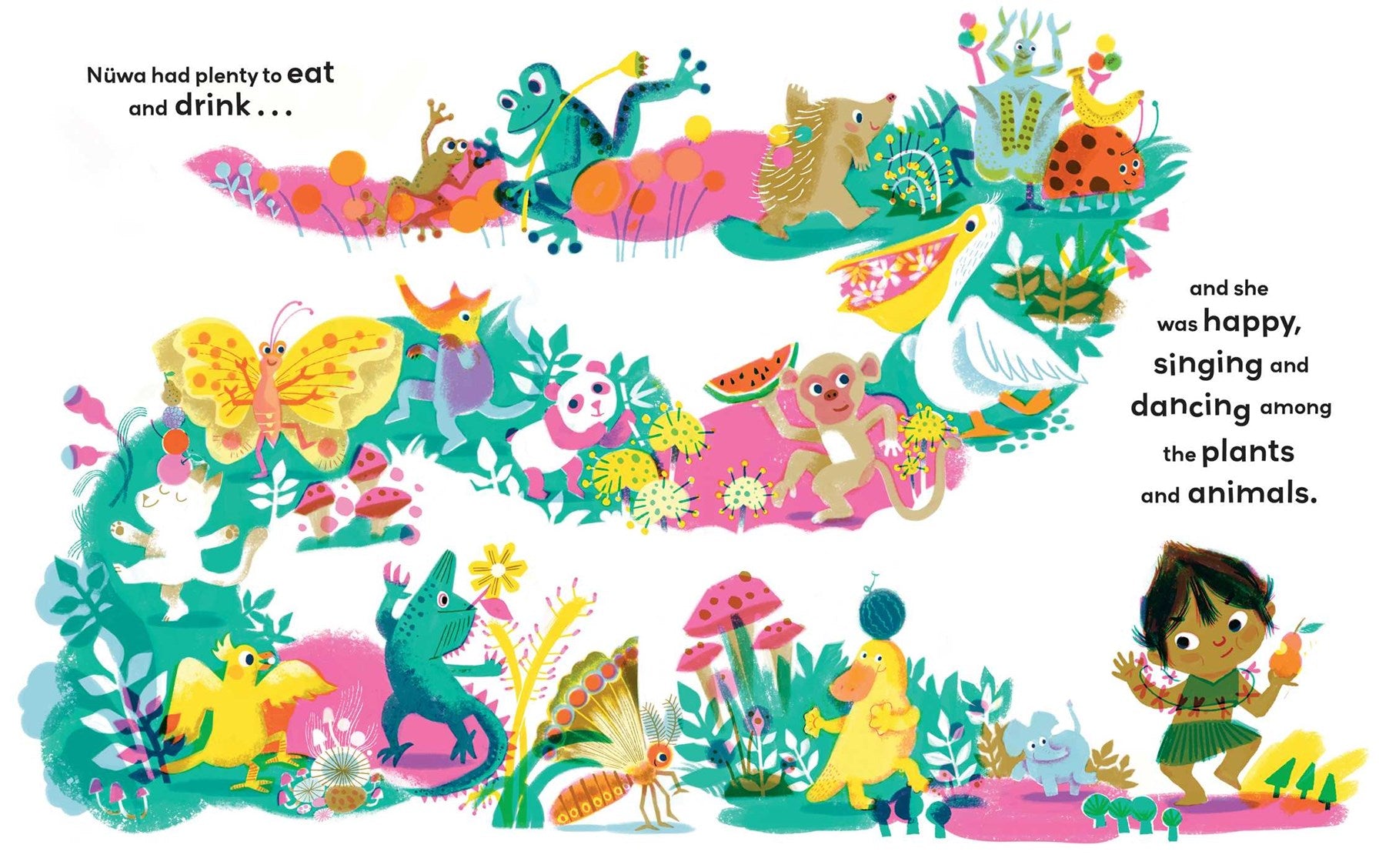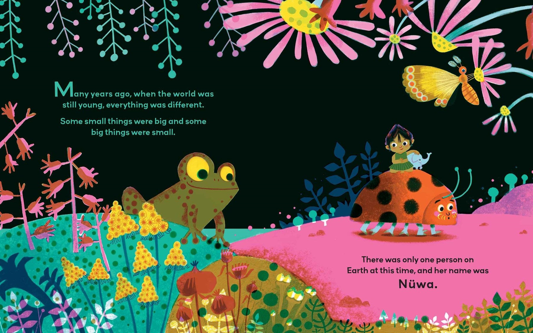 Many years ago, when the world was still young, Nüwa was the only person on Earth. She loved to play with the fish and the birds, but she longed for someone to talk to. Then one day, Nüwa found a way to create a friend, and when this new little person said, "Hello," something magical happened....