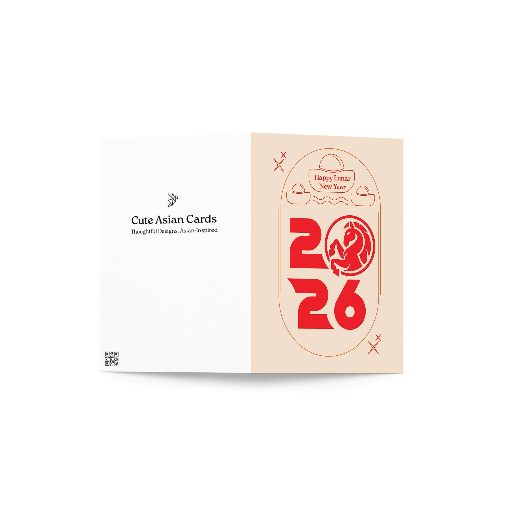 This card features a bold red typographic print of the year 2026 with a leaping horse and gold ingots above it in a modern and minimalist line art style. It’s a playful take on prosperity and joy.