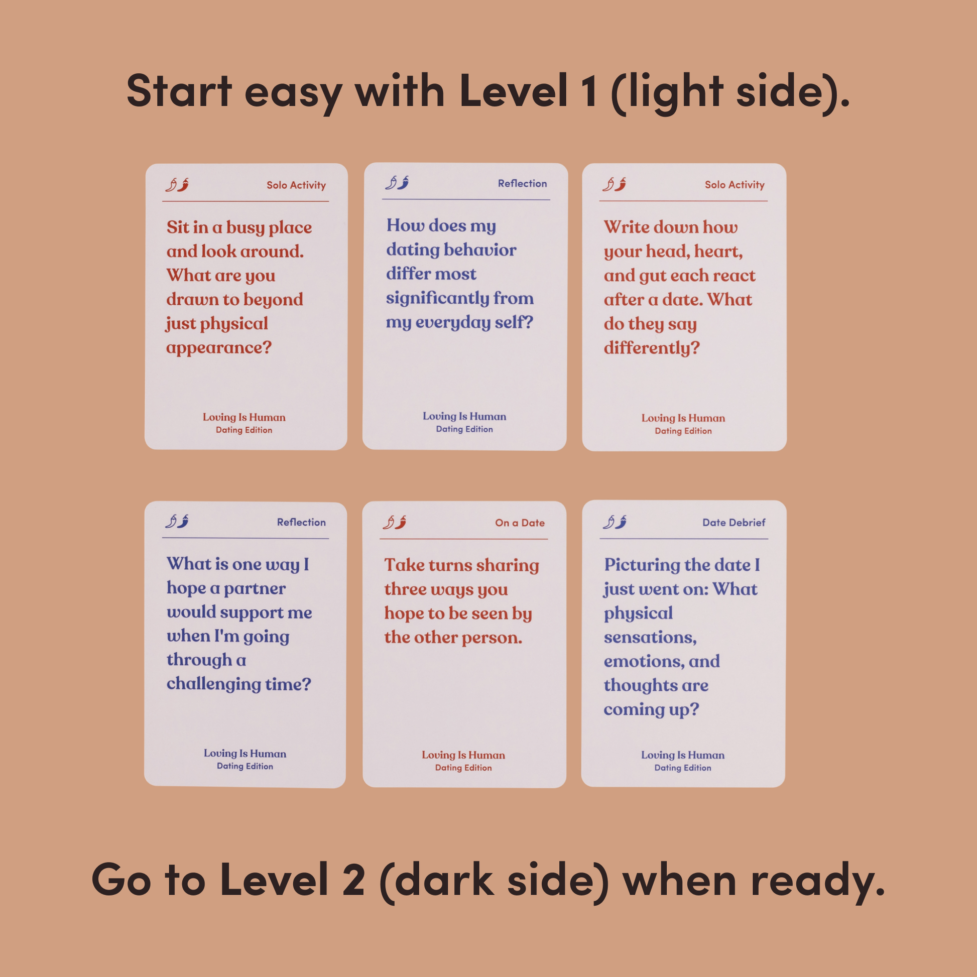 A self-reflection deck for both singles and people in early relationships to explore what they want out of their love life. Designed to be used solo.