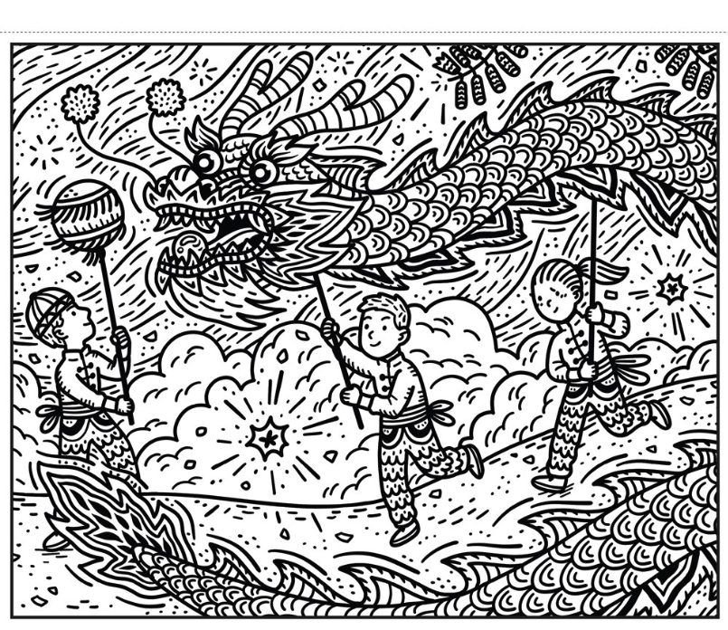 Packed with joyful scenes showing Lunar New Year being celebrated in different countries around the world, from dragon dancers and delicious food to kite flying in South Korea and a gloriously decorated temple in Malaysia. Just brush water over the black and white designs to reveal an array of vivid hues.
