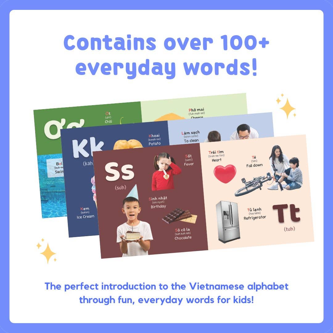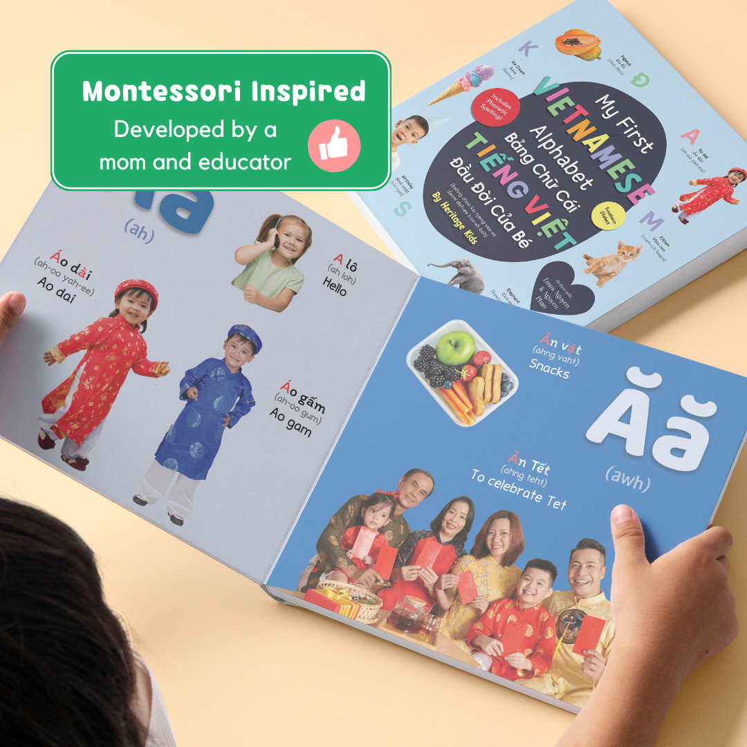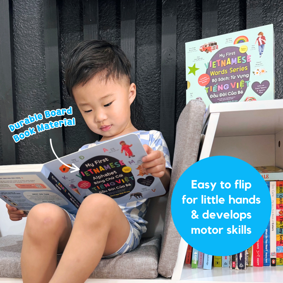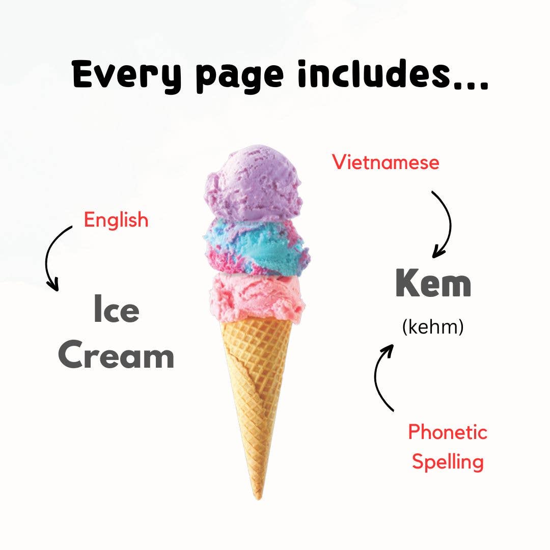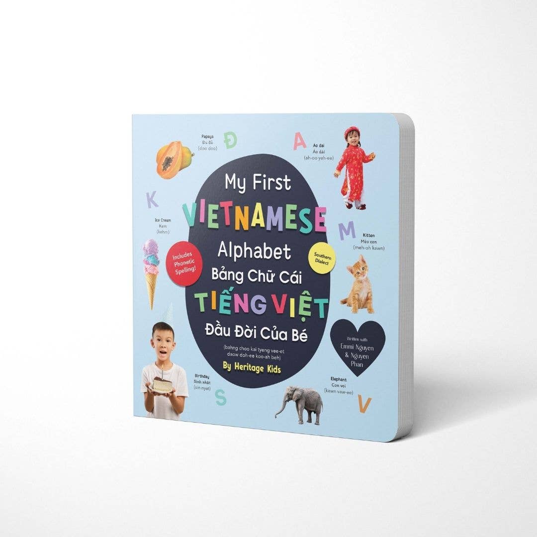 My First Vietnamese Alphabet is the perfect book to introduce children to the Vietnamese alphabet and words. Durably bound in board book form, the book contains over a hundred words that will help build your child’s vocabulary and knowledge of Vietnamese letters, while also encouraging a love of reading. The words are accompanied by vivid photographs that are translated into Vietnamese, English, and phonetic spelling which will help all members of the family read and speak Vietnamese words in no time.