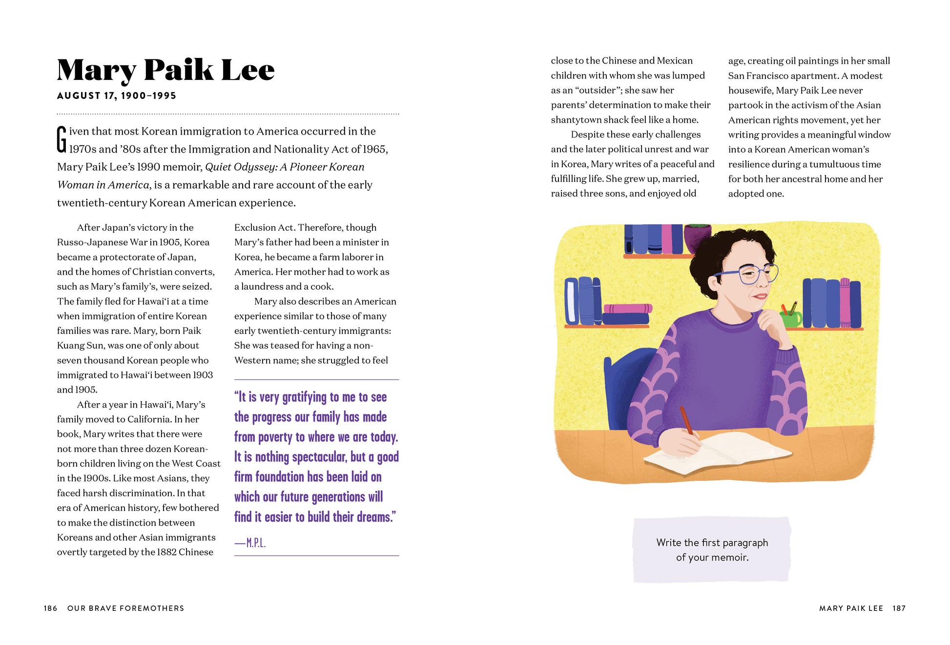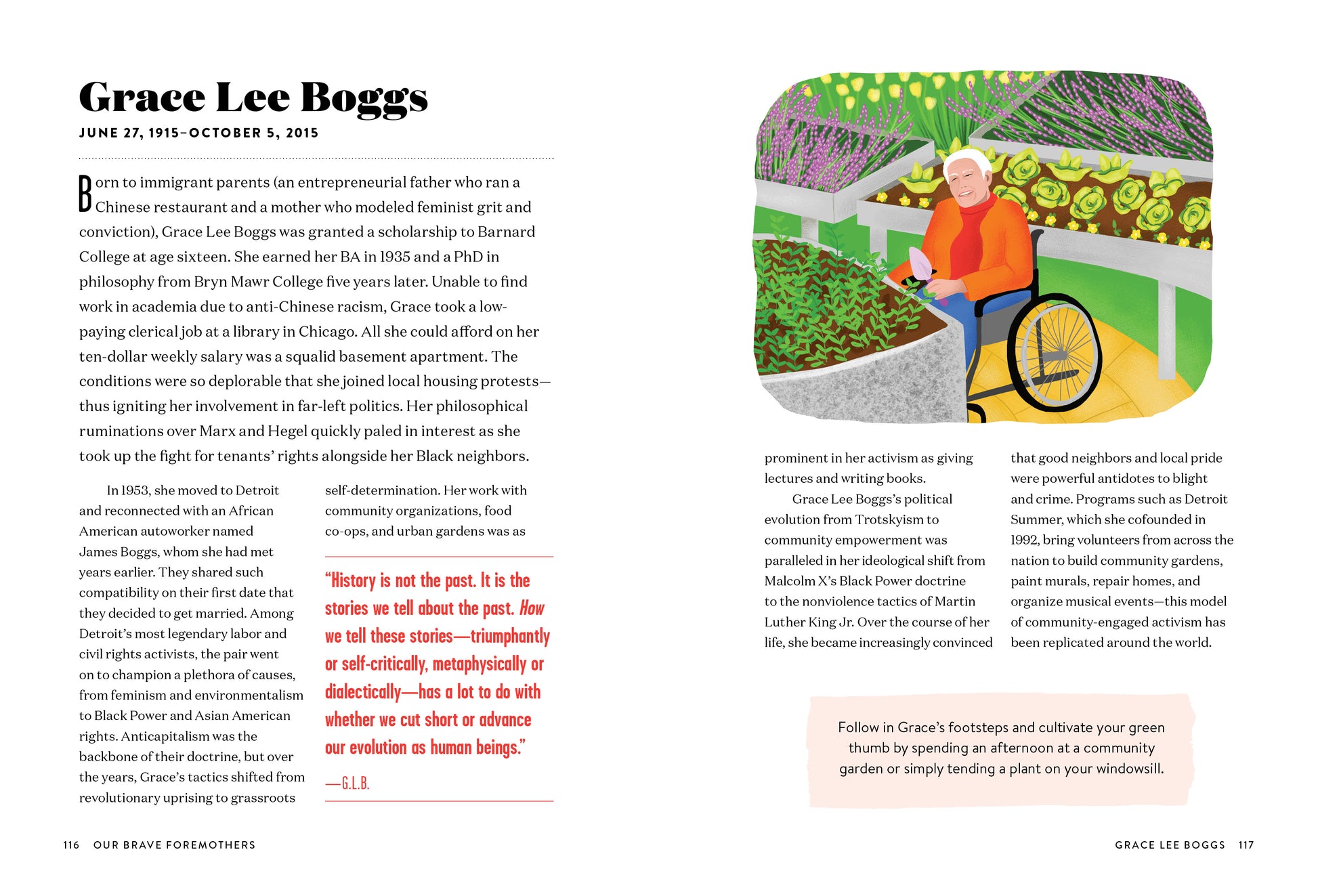 Following each entry is a prompt that asks you to connect your life to theirs, an inspiring way to understand their influence and the power of their stories. To consider on a deeper level the devotedness of Clara Brown, the fearlessness of Jovita Idár, the guts of Grace Lee Boggs, or the selflessness of Martha Louise Morrow Foxx. And to be as brave as we each can be—and then beyond that.