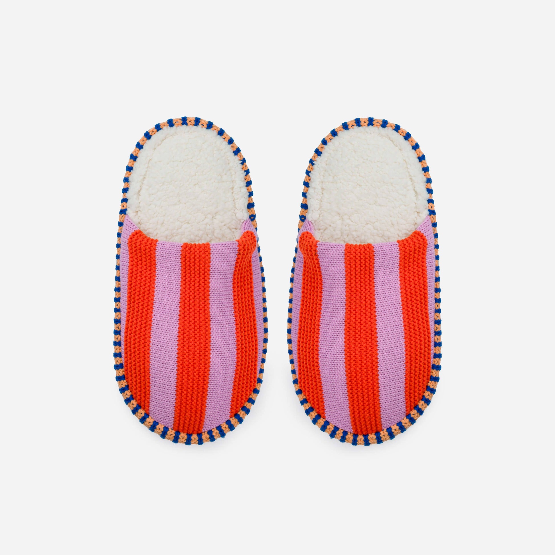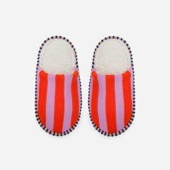 A plush, colorful take on your favorite spa-style house slippers. Backless slide slippers knit with a two-tone dimensional stripes